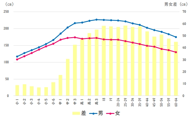男子は中1から中2で18.2cm、中2から中3で13.7cm伸びるのに対し、女子は中1から中2で4.9cm、中2から中3で1.9cmしか伸びないので、男女差が拡がることになります。