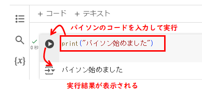 Python(パイソン)のコードを入力して、実行ボタンを押すと、プログラミング結果が表示されます。